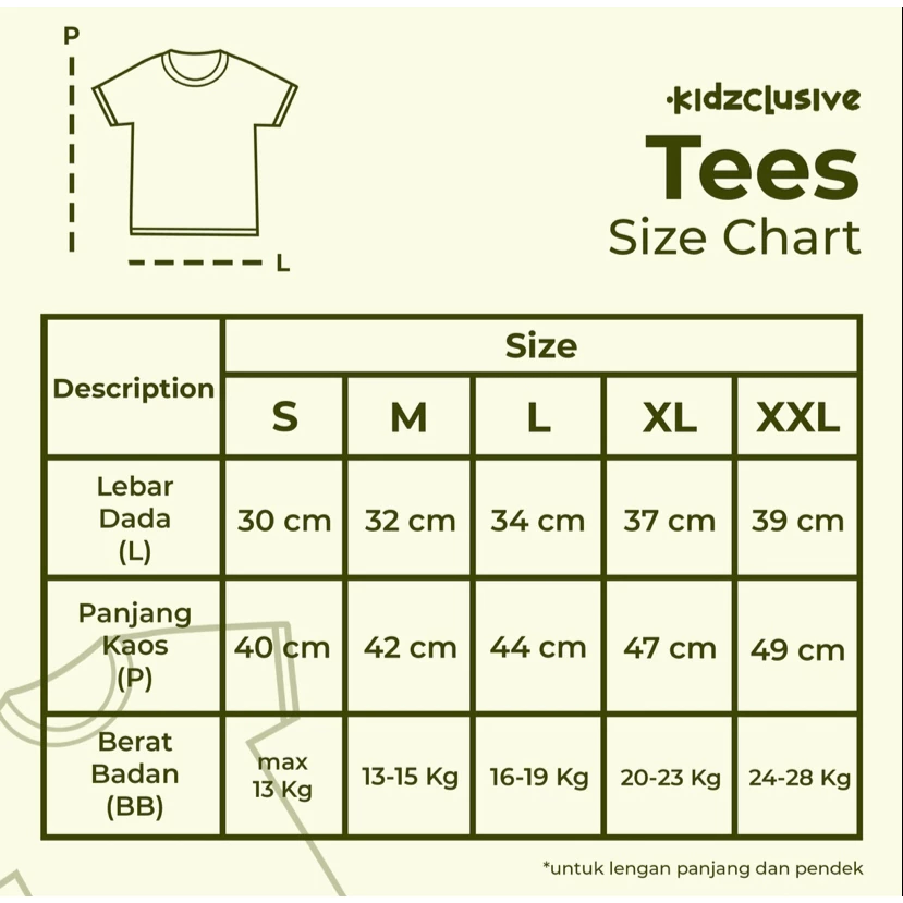 L Lebar Dada 35 cm-Panjang Kaos 46 cm- Berat badan 16-19 kg