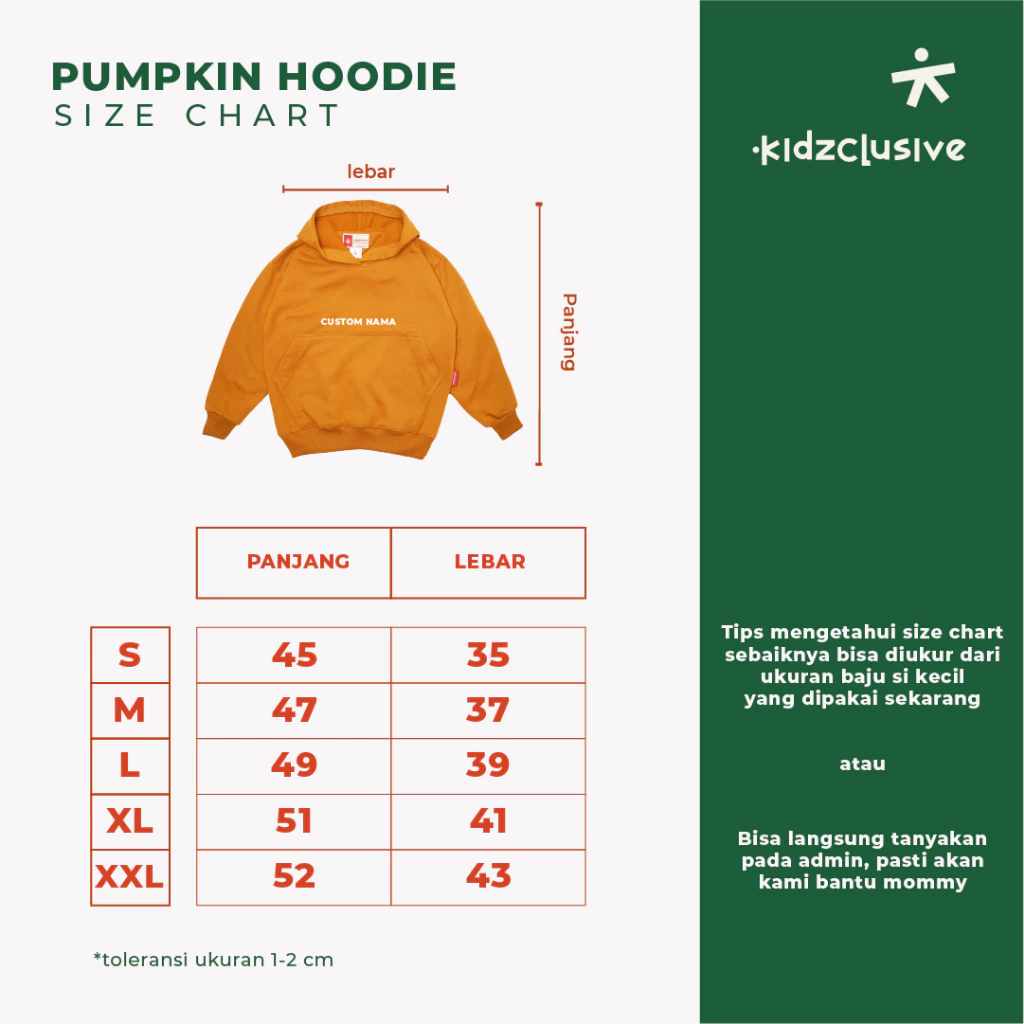 #Pumpkin Hoodie ini super imut banget! Tersedia untuk anak usia 1 s/d 9 tahun (tergantung berat badan). Untuk memastikan size yang pas untuk si kecil, ukur dulu yuk! Bisa chat admin untuk bantuan sizenya ya moms!